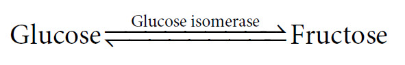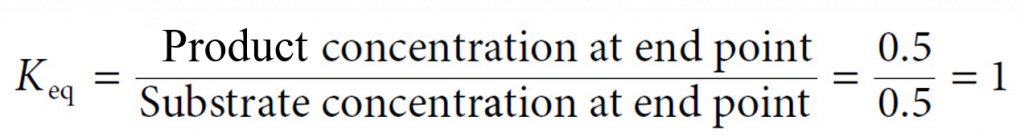 In this reaction, if we start with a solution of 1 M glucose and add the enzyme, then upon completion we will have a mixture of approximately 0.5 M glucose and 0.5 M fructose. This is the equilibrium point of this particular reaction. Although it may only take a couple of seconds to reach this end point with the enzyme present, we would in fact, come to the same point if we put glucose into solution and waited many months for the reaction to occur in the absence of the enzyme. Interestingly, we could also have started this reaction with a 1M fructose solution, and it would have proceeded in the opposite direction until the same equilibrium point had been reached.The equilibrium point for this reaction is expressed by the equilibrium constant, Keq, as follows: