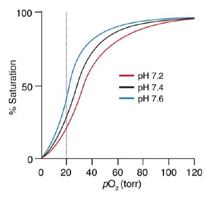 The Bohr effect is a physiological phenomenon first described in 1904 by the Danish physiologist Christian Bohr: hemoglobin’s oxygen binding affinity is inversely related both to acidity and to the concentration of carbon dioxide. The diagram below shows the effect of pH on O2 binding to Hb. The experimental observation is that at pH 7.2 and 20 torr, more O2 is unloaded than at pH 7.6 (Figure 6.19).