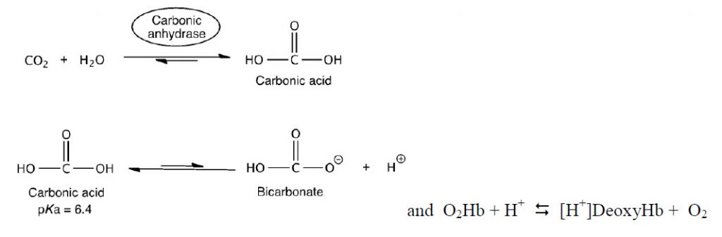To think about the basis of this pH effect, recall three important factors: (1) CO2/HCO3– exist in equilibrium within biological systems and can effect the overall pH, (2) deoxyHb is a stronger base than O2•Hb, and (3) in red blood cells (RBCs), there is an enzyme called carbonic anhydrase, which catalyzes the hydration of CO2 by water to form HCO3– .