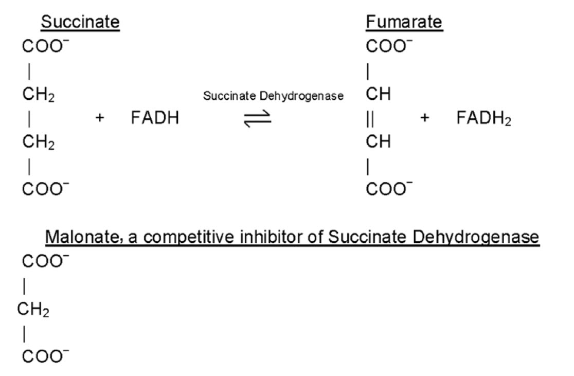 Inhibitors are classified as reversible inhibitors when they bind reversibly to an enzyme. A molecule that is structurally similar to the normal substrate may be able to bind reversibly to the enzyme’s active site and therefore act as a competitive inhibitor. (Figure 6.11) For example, malonate is a competitive inhibitor of the enzyme succinate dehydrogenase, as it is capable of binding to the enzyme’s active site due to its close structural similarity to the enzyme’s natural substrate, succinate (see below). When malonate occupies the active site of succinate dehydrogenase it prevents the natural substrate, succinate, from binding, thereby slowing down the rate of oxidation of succinate to fumarate (i.e. inhibiting the reaction).