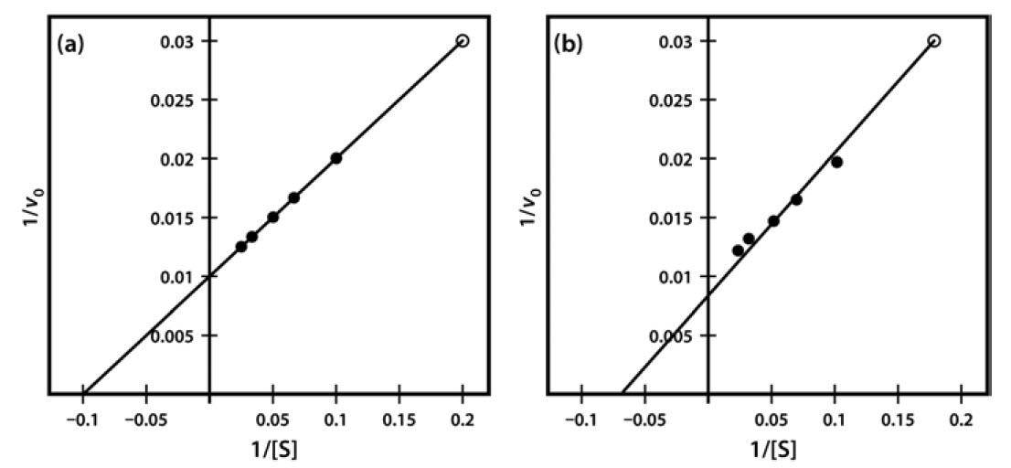 Figure 6.8 Lineweaver-Burk Plot of Similar Kinetic Data, Which Differ Only in a Single Data Point (Final data point (a) 1/v 0.03 at 1/S of 0.2 and (b) 1/v 0.031 at 1/S of 0.18).