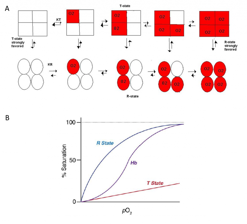 Figure 6.18 Dynamics of Oxygen Binding in Hemoglobin. As shown in (A) above, the tense-state (T-state) of hemoglobin is favored when oxygen binding is low. The tetramer shifts from the T-state to the relaxed-state (R-state) with oxygen binding. In fact, the binding of one oxygen with one subunit increases the liklihood of oxygen binding with other subunits, known as cooperativity. (B) shows the graphic representation of Hemoglobin (Hb) binding to oxygen which transitions between the T-state and R-state.
