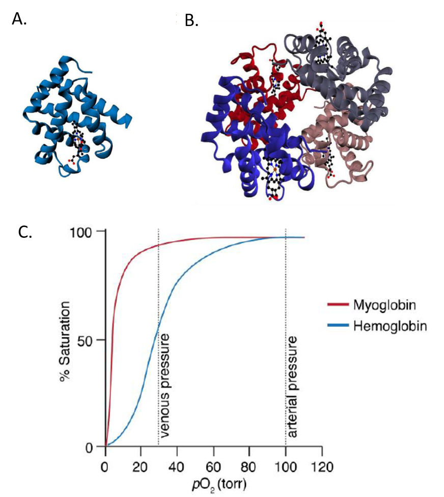 Hemoglobin is a tetrameric protein made up of two alpha subunits and two beta subunits. It is homologous with the monomeric oxygen-binding protein, myoglobin. As seen in Figure 6.17, oxygen binding to myoglobin gives a standard hyperbolic profile, whereas hemoglobin shows sigmoidal oxygen binding. The sigmoidal kinetic profile of hemoglobin indicates that oxygen binding is cooperative or that the binding of one oxygen to one subunit, increases the likelihood that oxygen will bind at another subunit.