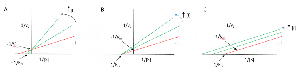 The effects of reversible inhibitors can be easily identified using the Lineweaver-Burk diagram as shown in Figure 6.14.