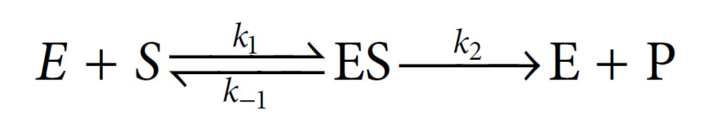 In 1913, Leonor Michaelis and Maud Menten first showed that it was in fact possible to derive this equation mathematically from first principles, with some simple assumptions about the way in which an enzyme reacts with a substrate to form a product. Central to their derivation is the concept that the reaction takes place via the formation of an ES complex which, once formed, can either dissociate (productively) to release product, or else dissociate in the reverse direction without any formation of product. Thus the reaction can be represented as follows, with k1, k−1 and k2 being the rate constants of the three individual reaction steps: