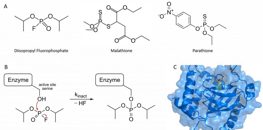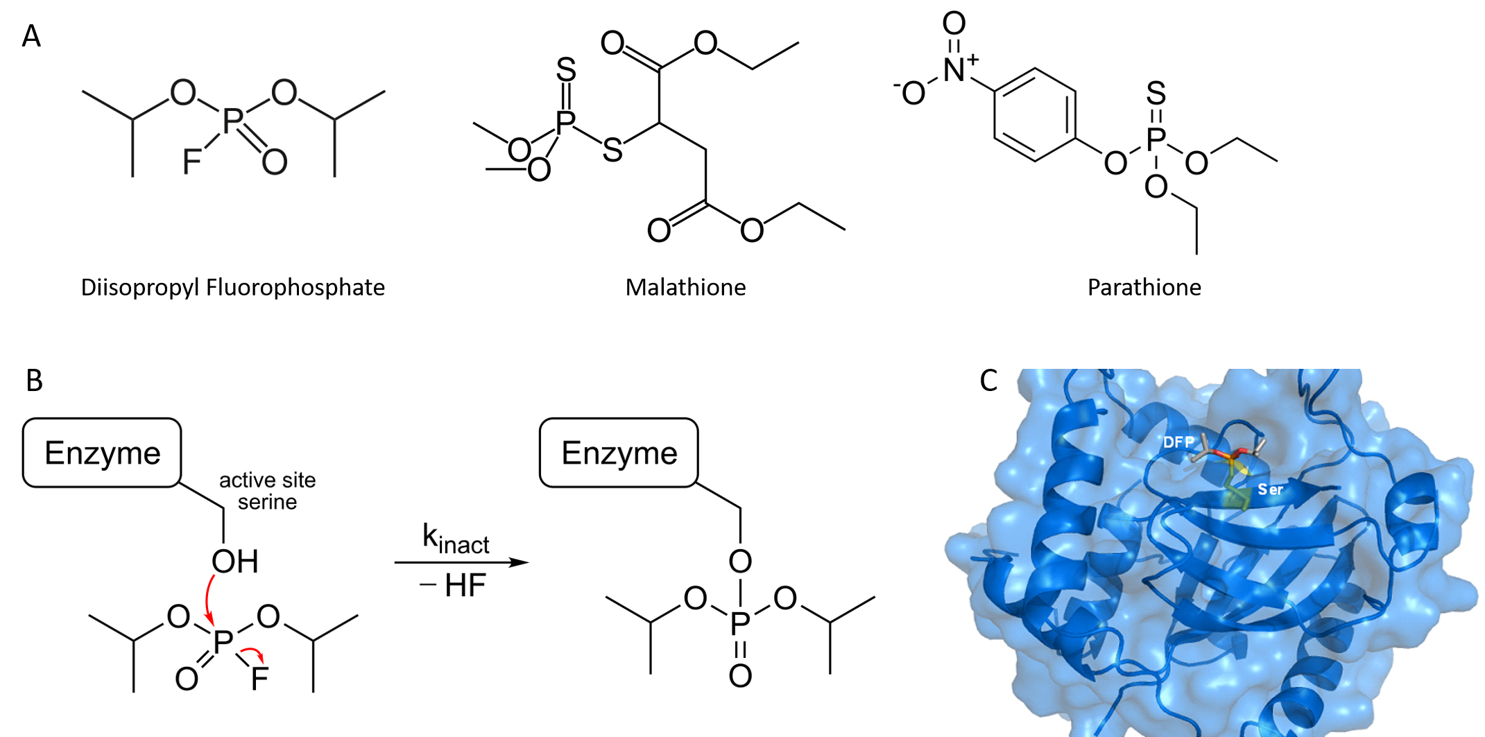 Organophosphorus compounds such as diisopropyl fluorophosphate (DFP) inhibit acetylcholinesterase activity by reacting covalently with an important serine residue found within the active site of the enzyme. The physiological effect of this inactivation is interference with neurotransmitter inactivation at the synapses of nerves, resulting in the constant propagation of nerve impulses, which can cause muscle convulsions and lead to death. DFP was originally evaluated by the British as a chemical warfare agent during World War II, and modified versions of this compound are now widely used as organophosphate pesticides, including parathione and malathione (Figure 6.15). Notably DFP is also a potent inhibitor of the protease enzyme from the Herpes Simplex Virus and has been used to study the active site dynamics of this protein (Figure 6.15). Many drugs also act as irreversible inhibitors, including the β-lactam antibiotics like penicillin.