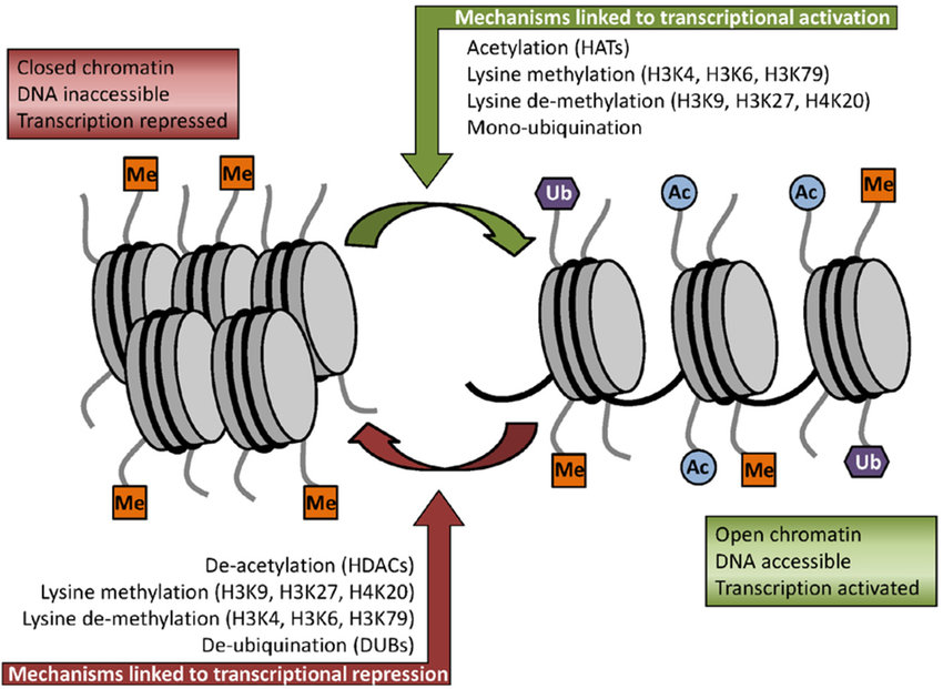 Figure 8.12 Some of the key histone modifications influencing gene expression (Me: methylation, Ub: ubiquination, Ac: acetylation).