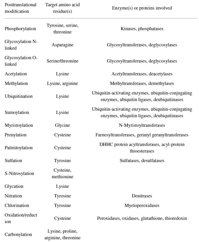 Table 8.1 Common Protein Post-Translational Modifications, Their Target Amino Acid Residues, and the Enzyme(s) or Proteins Involved