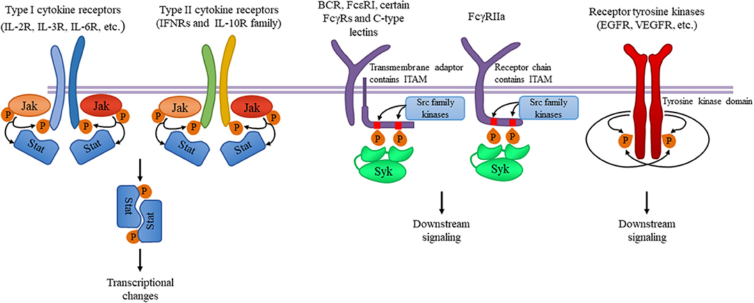 Figure 8.6. Tyrosine kinases and their signaling pathways. Type I and type II cytokine receptors utilize Janus kinases for the initiation of downstream signaling involved in the inflammatory responses.  Src-family kinases and Syk are involved in several immune cell signaling pathways like immunoreceptor, integrin and C-type lectin signaling. Upon ligand binding, activation of Src-family kinases leads to the phosphorylation of tyrosine residues in immunoreceptor tyrosine-based activation motifs (ITAMs), that can be part of a transmembrane adaptor molecule like in case of B cell receptor (BCR), FcεRI, and certain FcγRs and C-type lectins, or of the receptor chain itself like in FcγRIIa in humans. Syk is recruited to the dually phosphorylated ITAMs and becomes activated resulting in the recruitment and activation of various further adapter proteins promoting downstream signaling. Receptor tyrosine kinases, for example EGFR and VEGFR have intrinsic tyrosine kinase activity leading to auto-and transphosphorylation of the receptor chains upon ligand binding. Recruitment of several adaptors and effector molecules through SH2 and phosphotyrosine binding domains mediate downstream signaling.