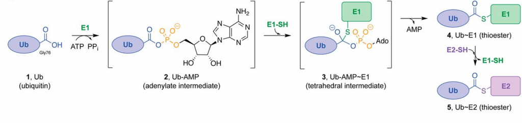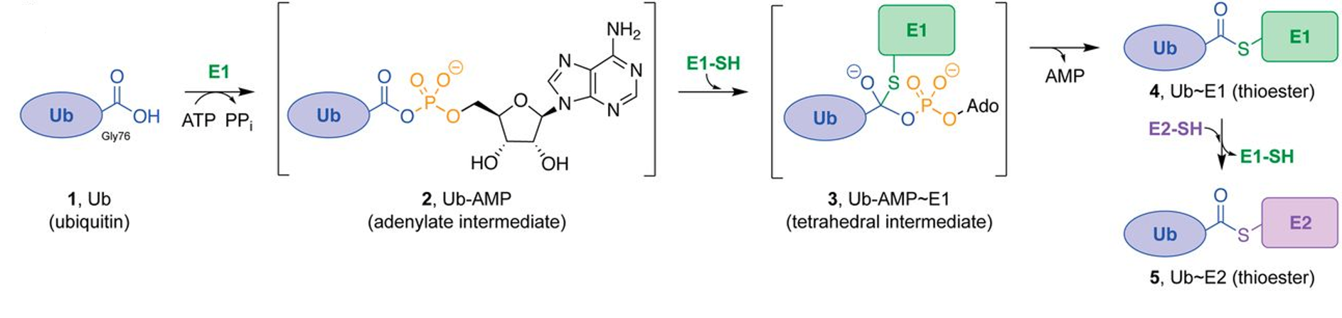 Figure 8.17 Enzymatic Activity of the E1 Ubiquitin Activating Enzyme.  Ub E1s catalyze adenylation of the Ub C-terminal glycine-76 (1 → 2) using a molecule of ATP, thioesterification with an E1 catalytic cysteine ensues (2 → 3 → 4), and transthioesterification to an E2 catalytic cysteine (4 → 5) completes the reaction.