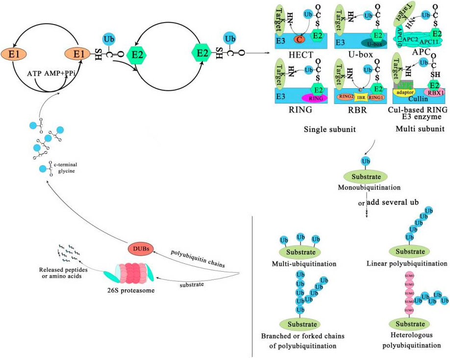 Figure 8.18 The Ubiquitin-Proteasome System. The process of ubiquitination from activation to attachment to the substrate is catalyzed by three major enzymes. The substrates labeled by ubiquitin are degraded by the 26S proteasome or play a non-degradative role in other processes. Abbreviations: APC, Anaphase-promoting complex; DUBs, Deubiquitinating enzymes; E1, Ubiquitin-activating enzyme; E2, Ubiquitin-conjugating enzyme; E3, Ubiquitin-ligase enzyme; Cul-based, Cullin-RING box1-Ligase; HECT, Homology to E6-AP C Terminus; Ub, Ubiqitin; SUMO, Small ubiquitin-related modifier; RBX1, RING-Box 1; RING, Really interesting new gene; RBR, RING1-IBR(cysteine/histidine rich region)-RING2.
