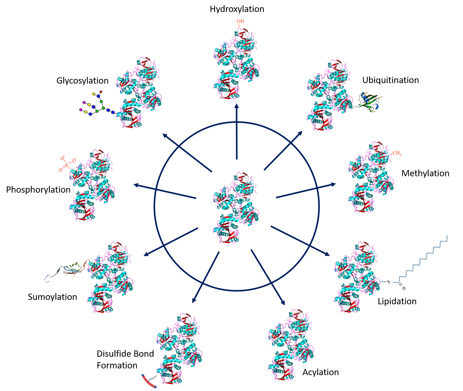Protein PTMs involve the covalent addition of some chemical group by enzymatic catalysis. Typically, an electrophilic fragment of a co-substrate is added to an electron-rich protein side chain, which acts as a nucleophile in the transfer. Common covalent protein PTMs include phosphorylation, acylation, methylation, sumoylation, ubiquitination, glycosylation, lipidation, oxidation and disulfide bond formation (either internal within a single protein or linking two protein/peptide chains together). Examples of common PTMs are provided in Figure 8.5.