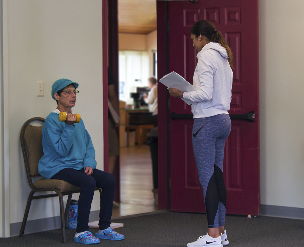 As the participants begin to arrive, the students finish setting up the room with free weights, resistance bands, and chairs. Today is the last day of class, and the “final” for the participants. They’ll be repeating the same fitness test they did on their first day to see how they’ve improved. The test involves assessments on balance, flexibility, and strength.