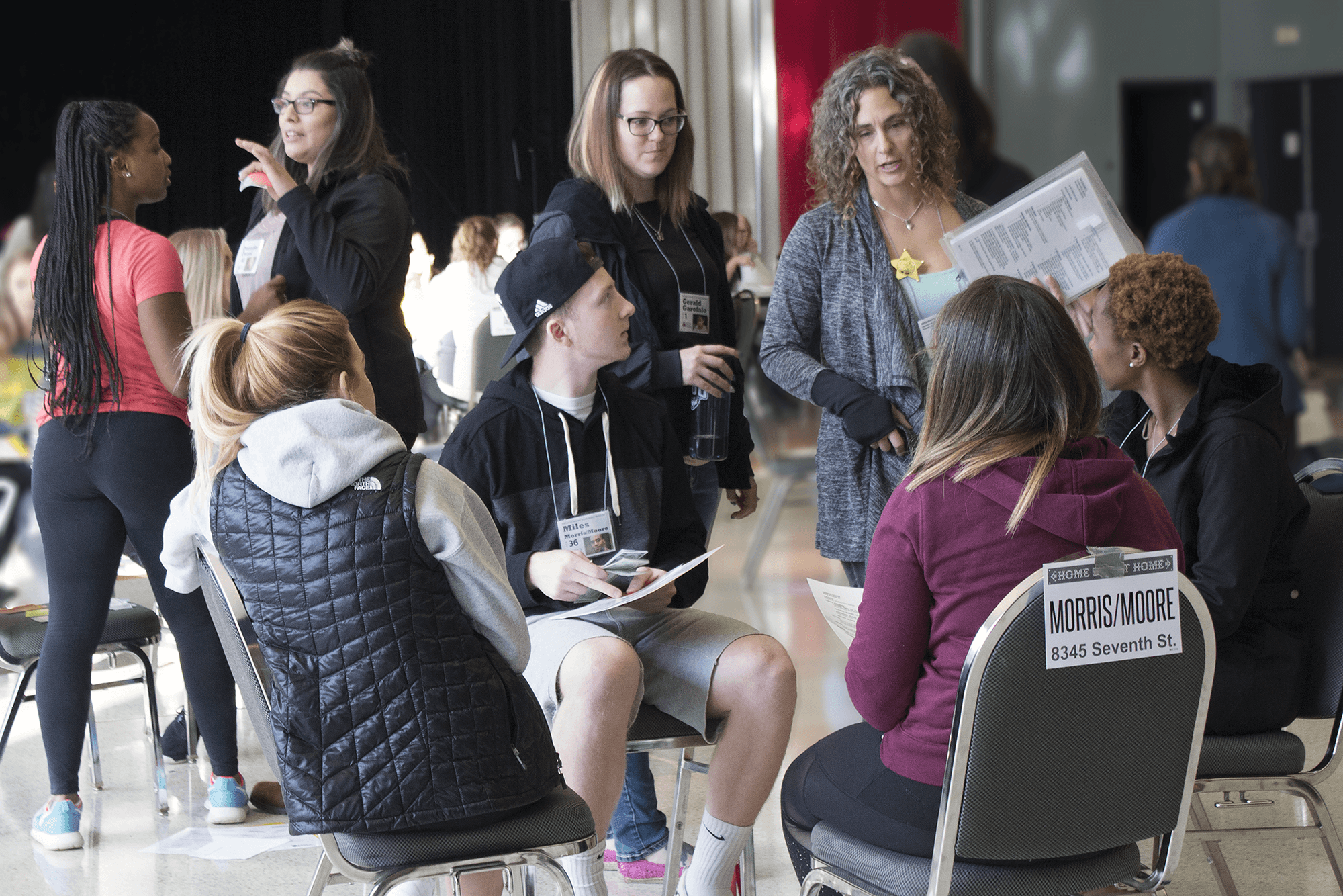 The simulation is conducted in a large room with the “families” seated in groups in the center of the room. Around the perimeter are tables staffed with student and faculty volunteers representing different community services, including a bank, employer, pawn broker, grocery store, social service agency, payday and title loan facility, mortgage company, school, health center, and child care center. The task of the “families” is to provide for basic necessities and shelter during the course of four 15-minute “weeks.”