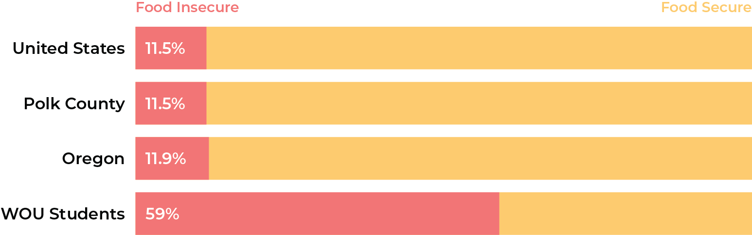 Did you guess correctly? Many people are familiar with the stereotype of “the poor college student,” and this data shows how severe it truly is, with more than half of WOU students in 2014 facing food insecurity. Students are a particularly vulnerable demographic because they face many expensive costs and generally have low incomes. This means that it is especially important for students to have reliable access to programs that help them meet their needs.