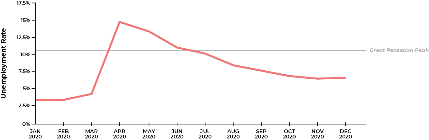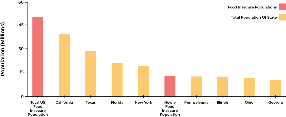 According to a Feeding America report, the projected national rate of food insecurity for 2020 is 15.6%, which is up from 11.5% in 2018. This increase represents an additional 13.2 million Americans experiencing food insecurity. To put that into perspective, the fifth most populous state, Pennsylvania, has 12.8 million people. Additionally, since the onset of the pandemic, the United States saw a dramatic increase in the unemployment rate, which undoubtedly affects people’s ability to provide food for themselves.