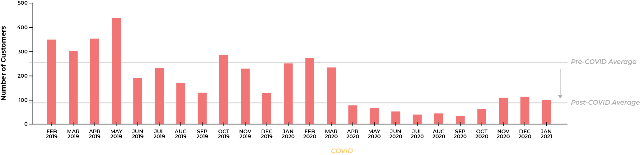 The global pandemic has affected many parts of our lives, and it has also had a big impact on the Food Pantry. The most noticeable for us was the way it affected the number of customers coming to see us. With everything that you know about COVID, do you think the number of visits to the Pantry would go up or down because of the pandemic? Let’s take a look: