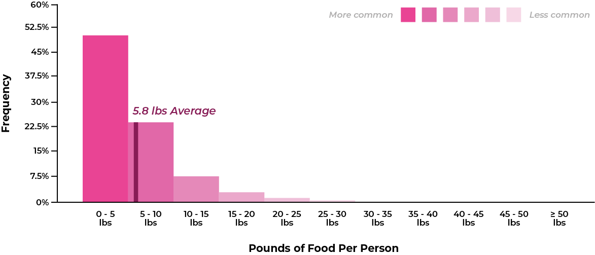 Result: About 75% of customers shop for between 0 and 10 pounds of food per person