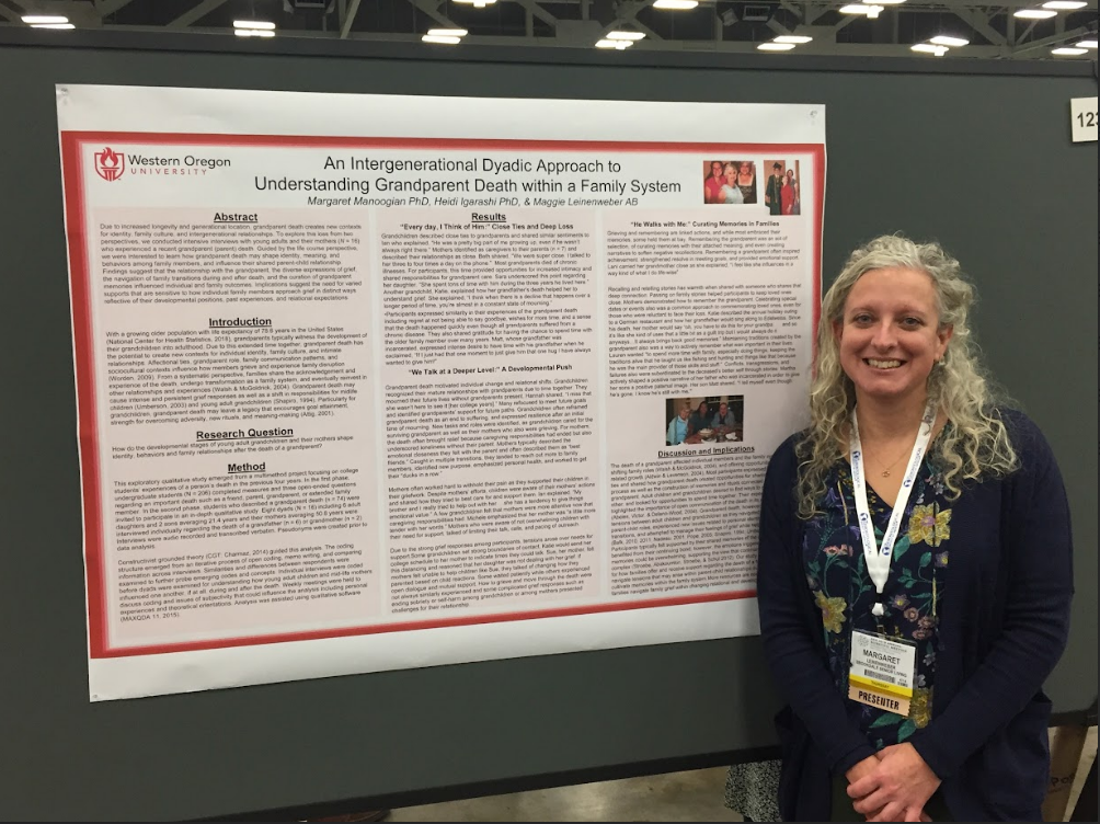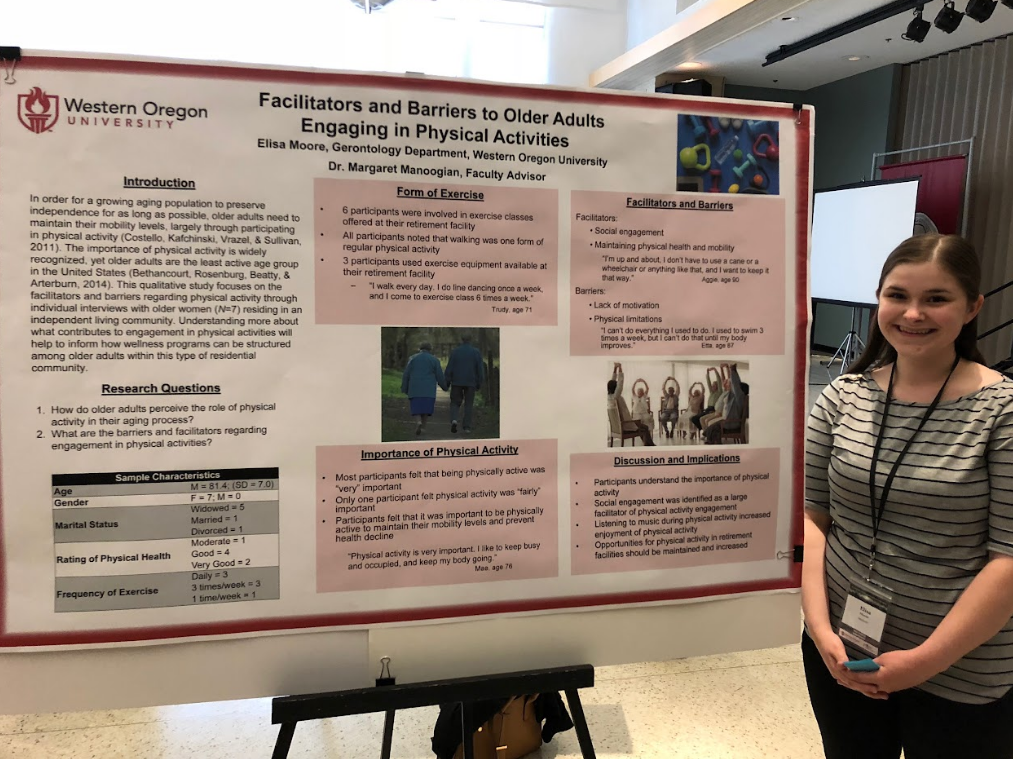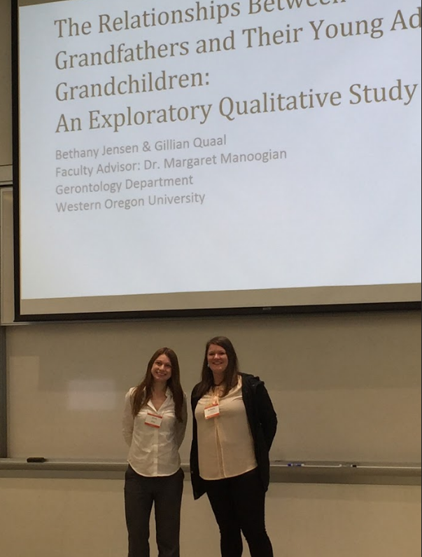 Gerontology students have had many opportunities to work closely with faculty to conduct, publish, and present research. Most students’ conference presentations have occurred at Western Oregon University’s annual Academic Excellence Showcase, although students have also traveled regionally and nationally to present with faculty at academic conferences!