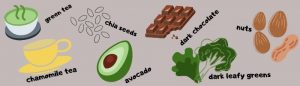 • Dark Chocolate: Dark chocolate has an anti-oxidant called Polphenols which help protect the body’s tissues against oxidative stress and inflammation. It also has a high level of Magnesium which helps regulate the stress hormone.