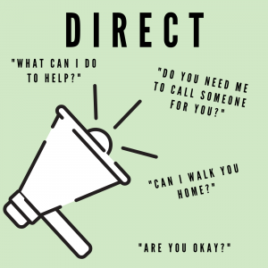 Distract: If you are not sure how to directly address the situation, it might be best to derail the conversation or disrupt someone from taking steps further. Check out this video of one of our favorite distractions!