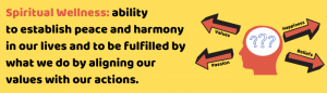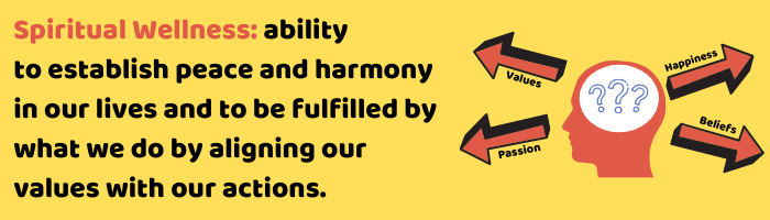 Spiritual Wellness is about having a set of guiding beliefs, principles, and values that give meaning, purpose, and direction to our lives. Spiritual wellness helps one find meaning purpose, and direction. The National Wellness Institute says spiritual wellness follows the following tenets: