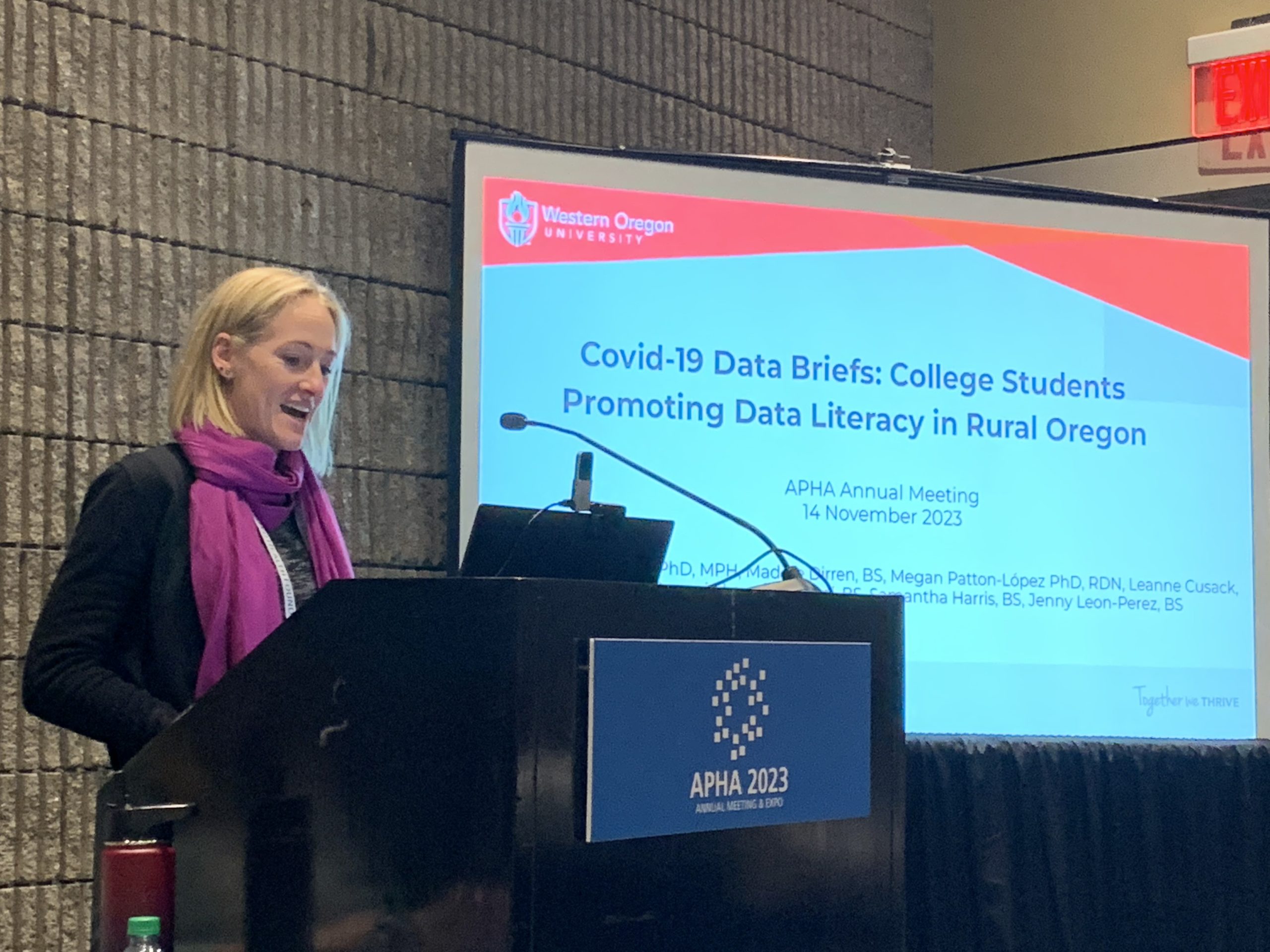 Emily Vala-Haynes presented at APHA (American Public Health Assoc) in 2023 about the COVID-19 project that happened on campus with Public Health students.