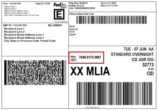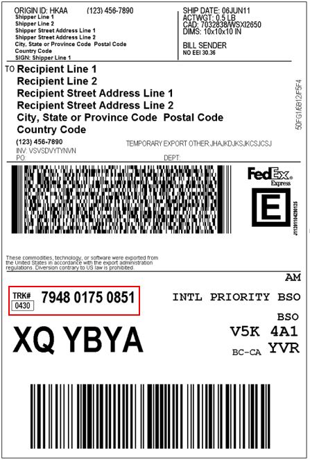 Don’t know which number is your tracking number? Usually it will be labeled “Airbill” “Waybill” “TRK#” or will be the number directly below the barcode. Honestly, if one number doesn’t work, then try a different one! Below are some examples of different types of tracking numbers outlined in red (click on each picture to make it bigger).
