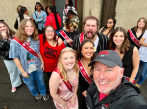 Pictured: Jesse Peters; president at WOU with students during the Homecoming tailgate.