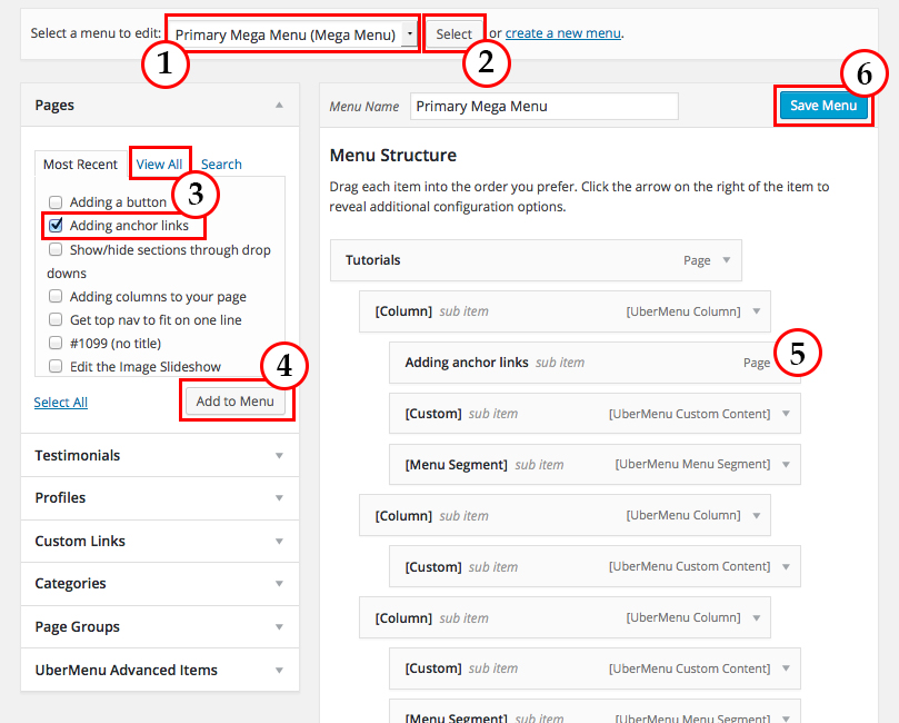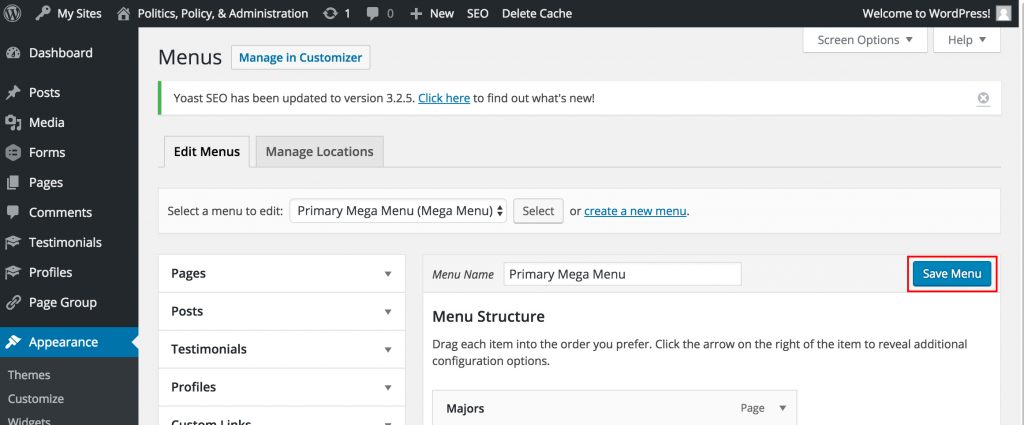 - Select “Primary Mega Menu (Mega Menu)” from the Select a menu to edit: dropdown.
