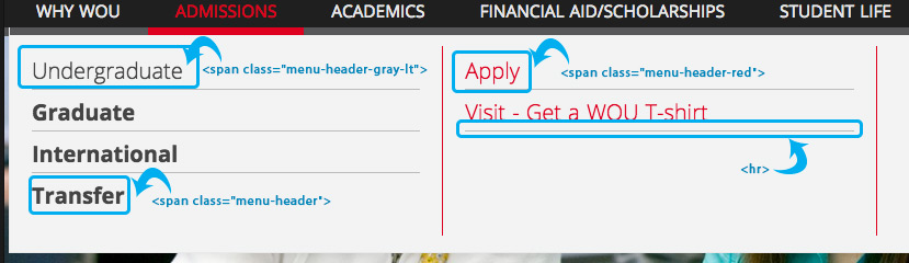 <span class="menu-header-gray-lt">LightGrayMenuHeader</span><span class="menu-header-red-lt">RedMenuHeader</span><span class="menu-header-gray-lt"><a href="#">LightGrayMenuHeaderWithLink</a></span><hr> (will get you a line that you can put ontop and below the headers)<hr style="margin-bottom:-20px;">(will give a good line for under a heading with a list of items to fall under it)