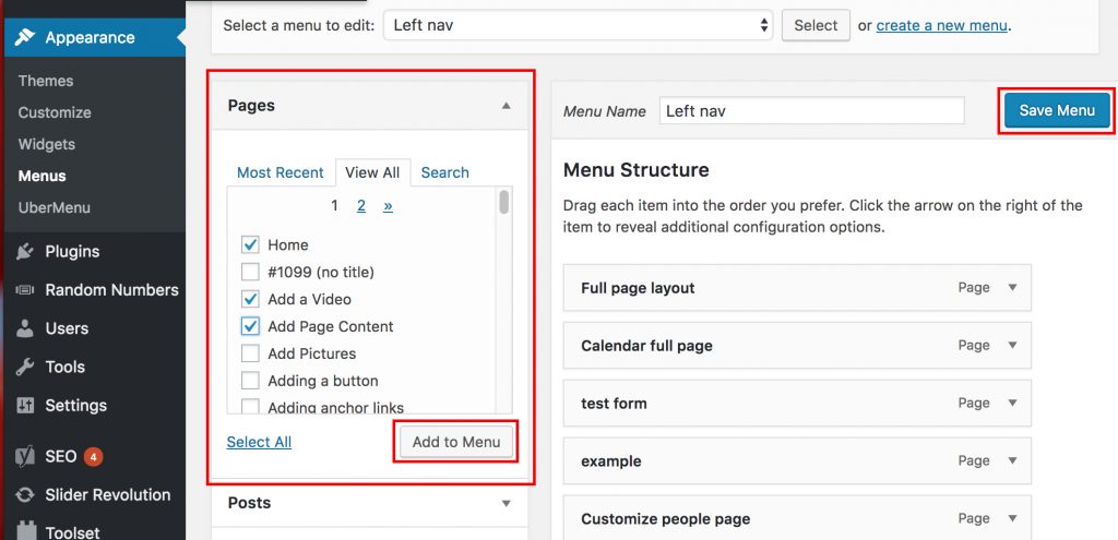 Check the box for any pages you would like to add and then click the button Add to Menu. You can drag and drop the pages to have them appear in any order you would like. Then select Save Menu.