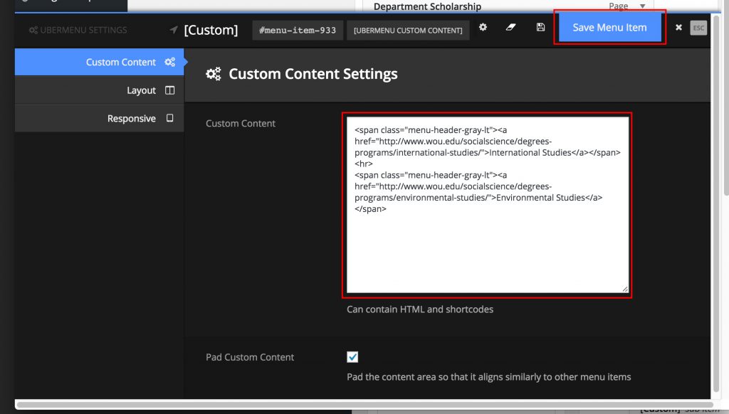 Copy and paste the custom code in the box and change out the links and heading names. Then click Save Menu Item.