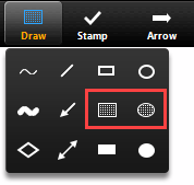 Draw: Insert lines, arrows, and shapes. Note: To highlight an area of the shared screen or whiteboard, select the indicated square or oval icon (below) to insert a semi-transparent square or oval. The color of the semi-transparent shape can be changed using the format button.