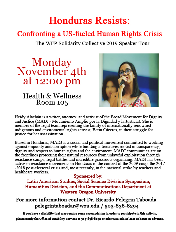 Heidy Alachán is a writing, attorney and activist of the Broad Movement for Dignity and Justice (MADJ – Movimiento Amplio por la Dignidad y la Justicia). She is a member of the leagal team representing the family of internationally renouned indigenous and environmental rights activist, Berta Cáceres, in their struggle for justice for her assassination.