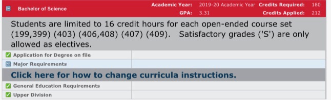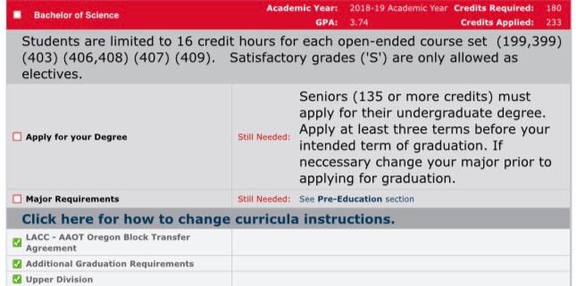 PLEASE WAIT to apply for your degree until you have started the licensure program, your major has been changed to Education, AND you have completed the 135 minimum credit requirement to enter a graduation application. To see the amount of completed credits you have, uncheck the two boxes at the top: “Include in-progress classes” and “Include preregistered classes,” then click on the “process new” button.