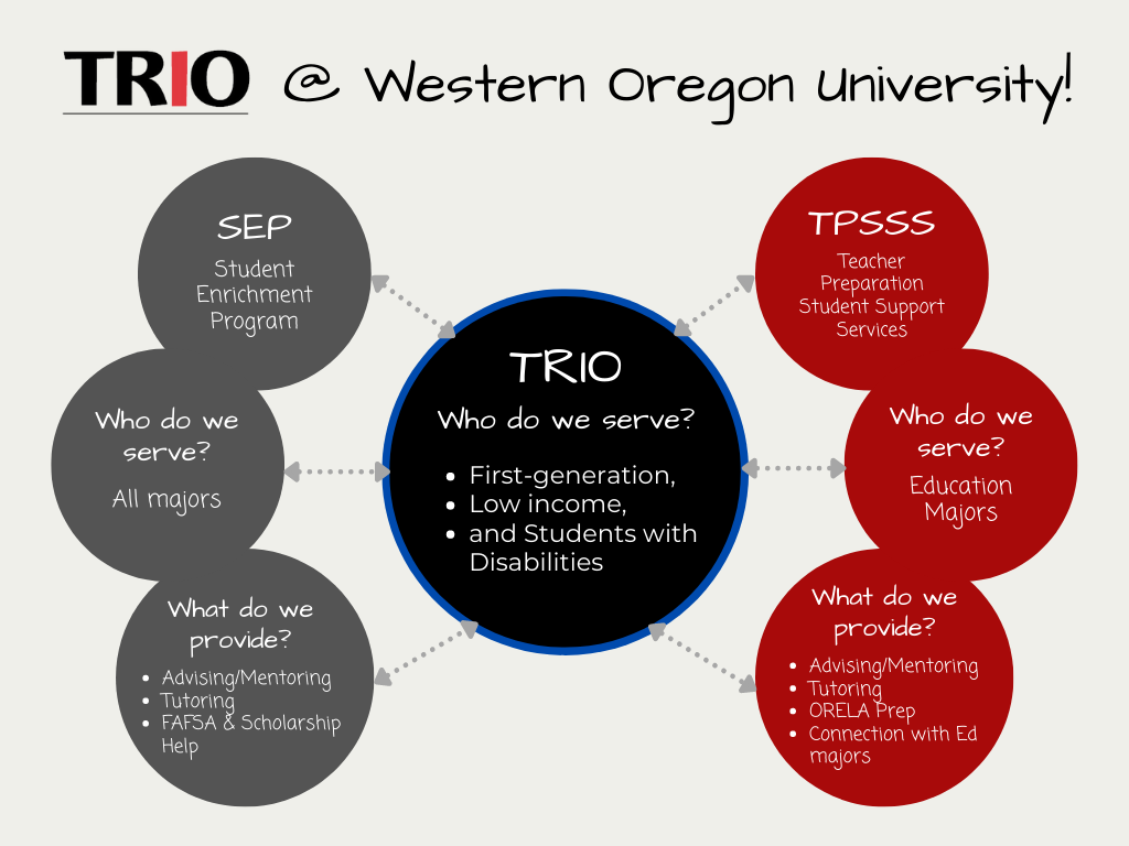 TRIO Programs are Federal outreach and student services programs designed to identify and provide services for individuals from disadvantaged backgrounds. TRIO includes eight programs targeted to serve and assist low-income individuals, first-generation college students, and individuals with disabilities to progress through the academic pipeline from middle school to postbaccalaureate programs.