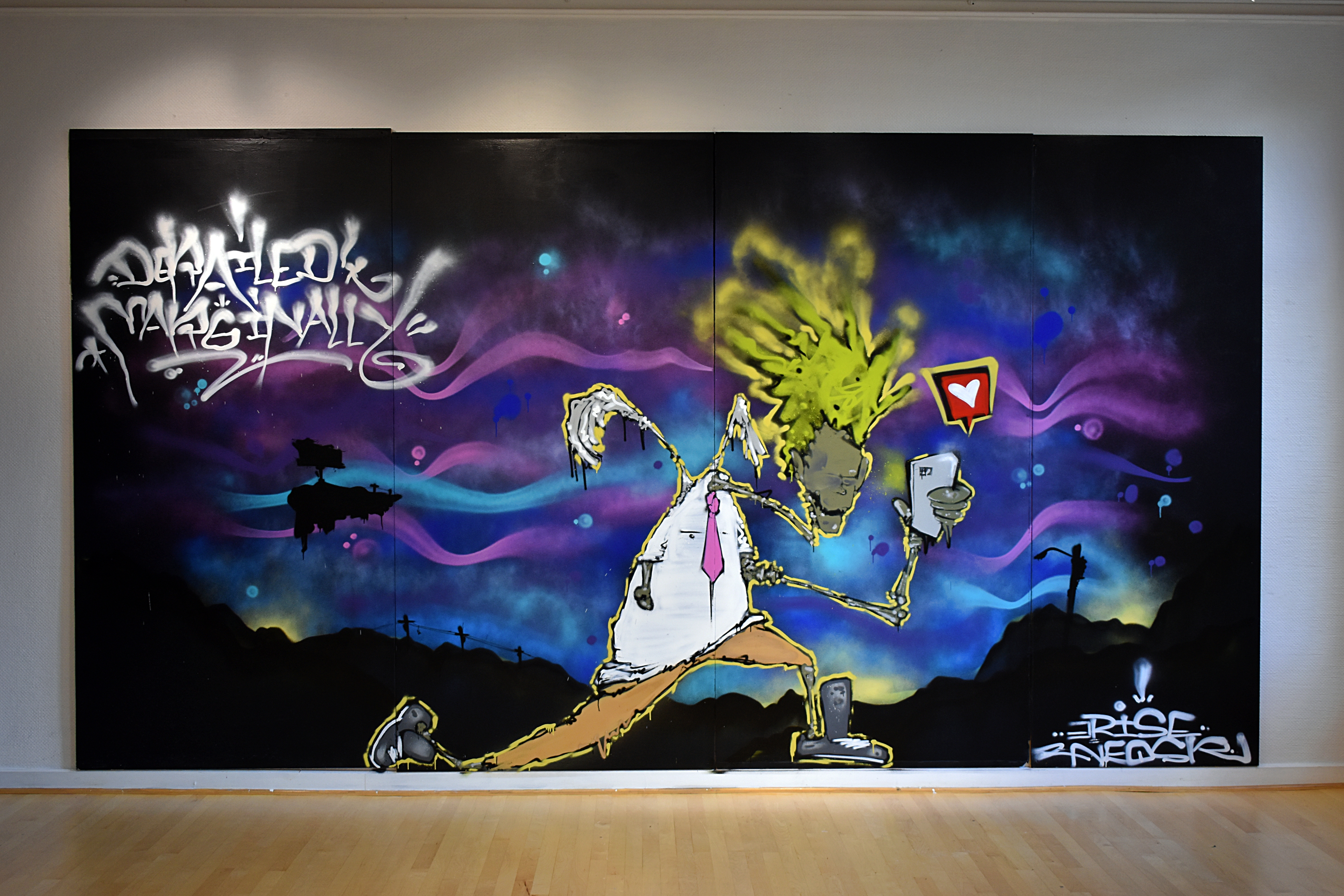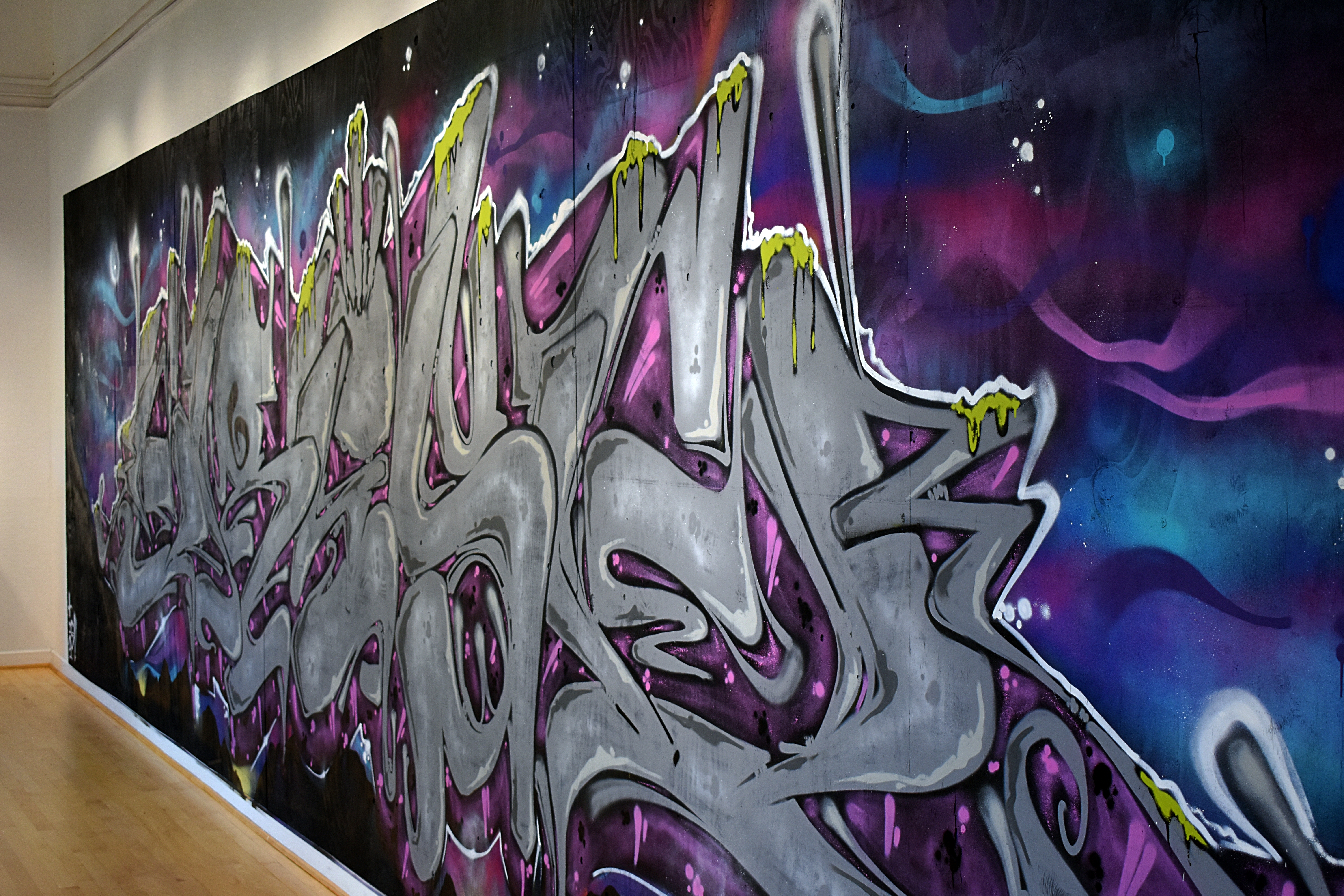Venturing outside of the student exhibits, Eric Tautkus, an aerosol and graffiti artist, has unveiled his newest art installation, “Derailed Marginally” in the Cannon Gallery of Art in Campbell Hall. This new work is a colorful, immersive piece spanning an impressive 50 feet — split between two walls. Smaller paintings by Tautkus are on display as well. When the exhibit closes on Oct. 29, two-foot square sections of Tautkus’ work will be sold to help fund the student gallery in the ITC.