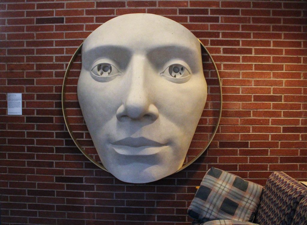 The second piece: Inside the south entrance of Bellamy Hall, the second piece in this collection titled, “Self-Reflection Progression: Portrait,” presents a more formed version of the face outside. Rather than simple line work, it has dimensions using faux limestones and brass.