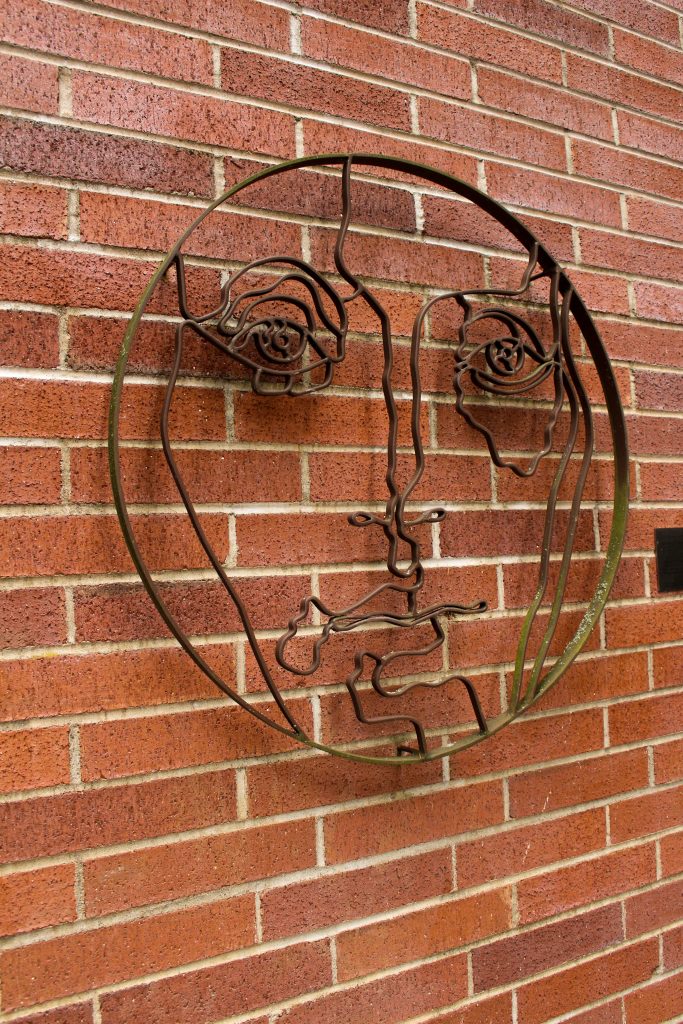 The first piece: Created by Colin Lambert and Peter Adams in 2009, titled “Self-Reflection Progression: Line Drawing” is placed on the wall outside of Bellamy, facing towards the science building on the ground level. The sculpture features a human face made of mild steel and seems composed of only one single line.