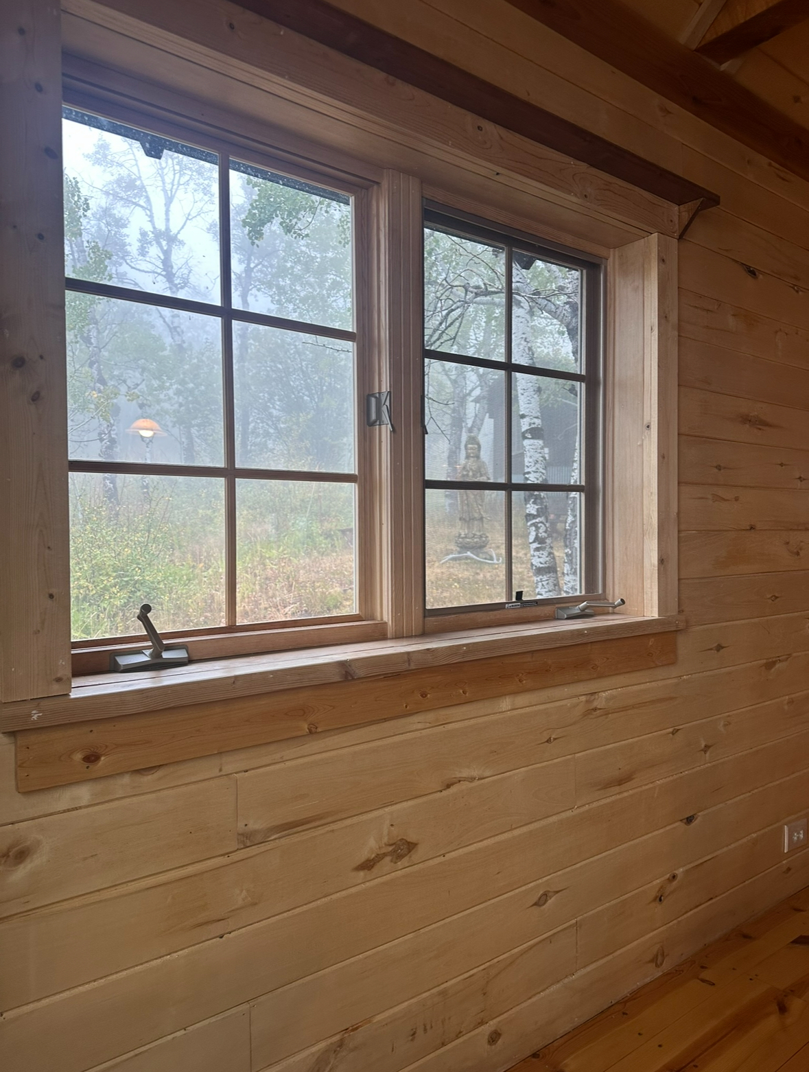 A photo of the window in the cabin with a traditional Sri Lanka Buddha outside. | Photo by Hannah Field
