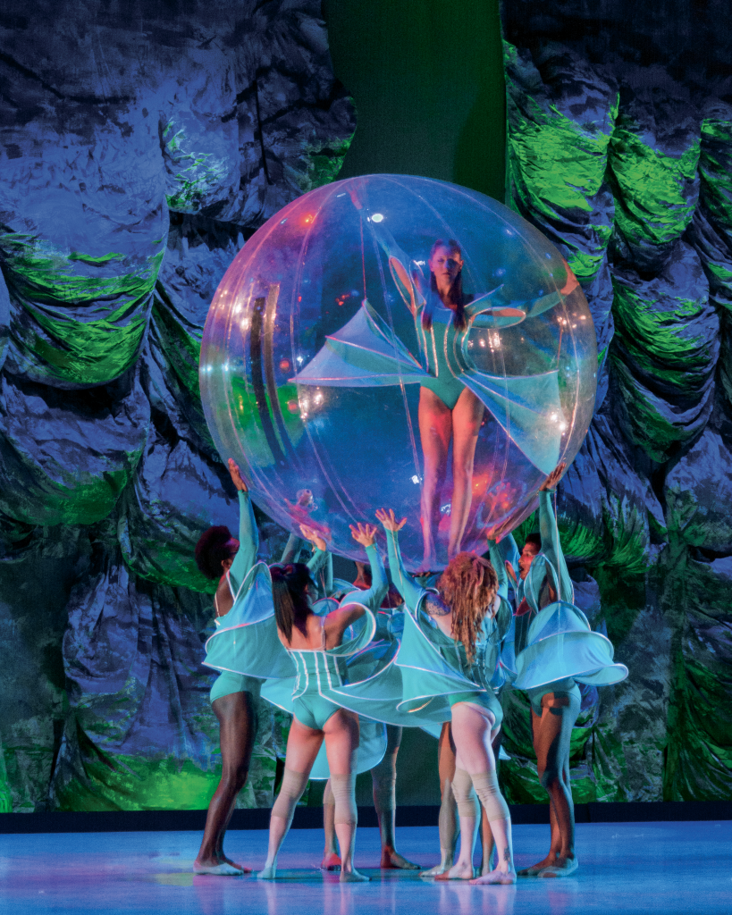 Act one, titled “Origins,” follows the development of life on Earth, starting within the darkness of the deep ocean. The audience witnesses the birth of single-celled organisms and their metamorphosis into more complex multi-celled beings and eventually primitive humans. The whole first act is submerged in complete darkness, with performers illuminated with suits of light. This type of dance is called “iLumiDance” by the dance company.