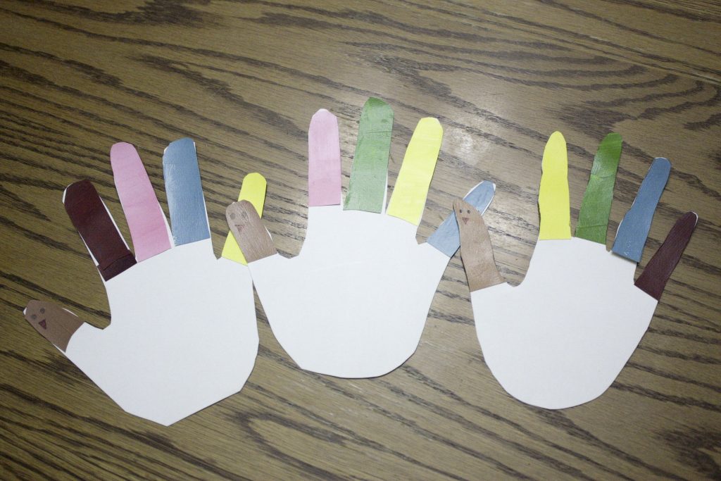 To make the hanging chain, repeat the process as many times as desired. Take the finished hand turkeys and glue the head of the turkey onto another turkey just below the tip of the pinky. Hang where desired when finished.