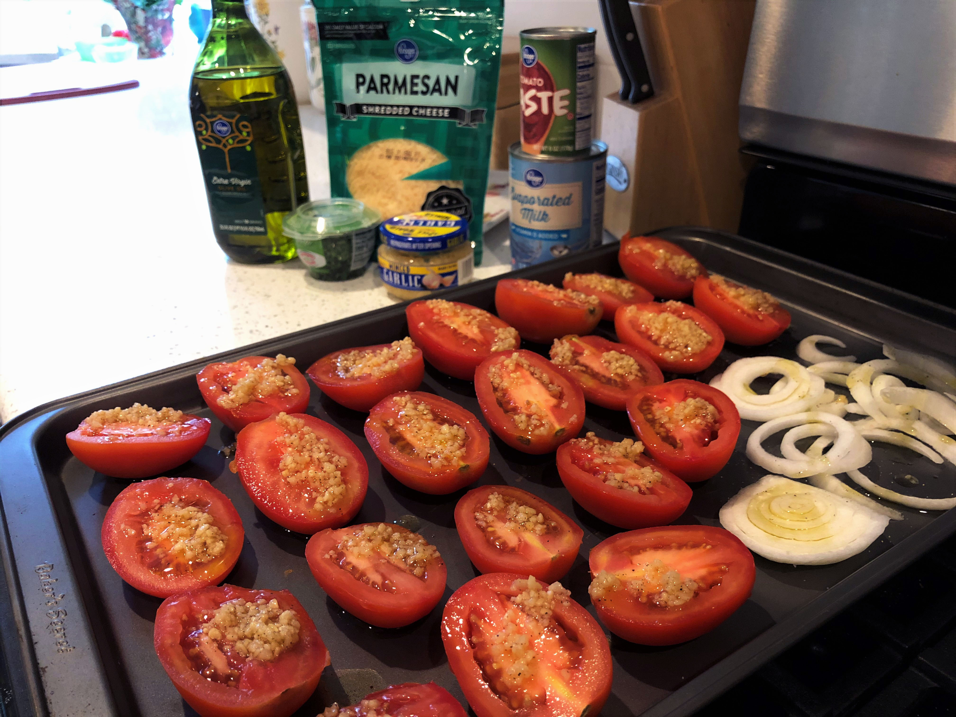 Preheat the oven to 400ºF. Halve tomatoes and place cut side up with the onion on a rimmed baking sheet. Drizzle with oil and add garlic, salt and pepper. Stir to coat well. Roast for 40 to 50 minutes, just until starting to brown.