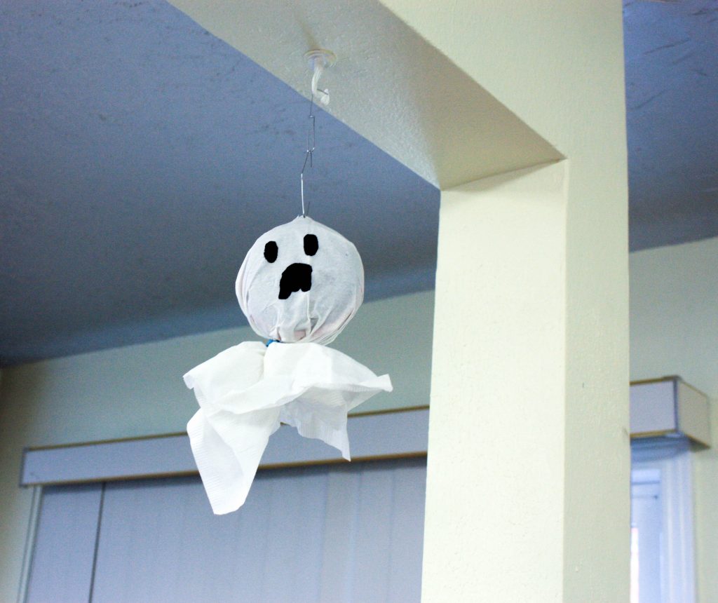 Create a spooky ghost to hang from the ceiling using simple household items. Take a round object like a tennis ball to use as a head, then gather some spare cloth thats cut into a square — length of cloth may vary depending on desired decoration size. Glue the tennis ball to the center of the cloth and attach thread to the top once dried.