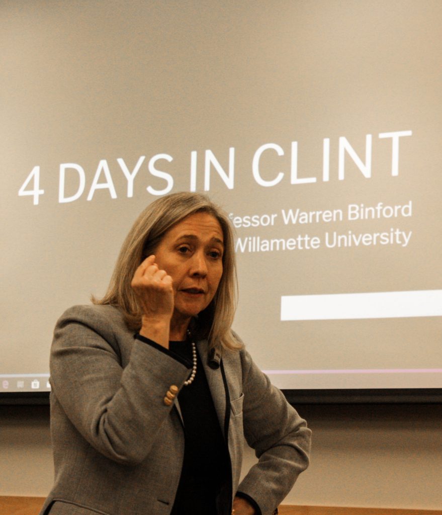On Wednesday, Oct. 23, Professor Binford was hosted by Western’s Model United Nations and the Salem United Nations Association to present a talk titled “4 Days in Clint,” which offered insight into the history of border control, included her accounts of the facilities detaining children separated from their loved ones, and proposed actions to increase awareness and support.