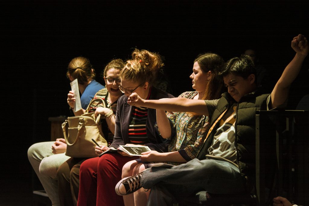 In an arena-type layout, every section of the audience experienced a different perspective of the play, accentuating the different perspectives of Eno’s characters and the complexity of the town. A rotating set allowed for the seamless transition between different scenes and took the audience on a tour of Middletown.