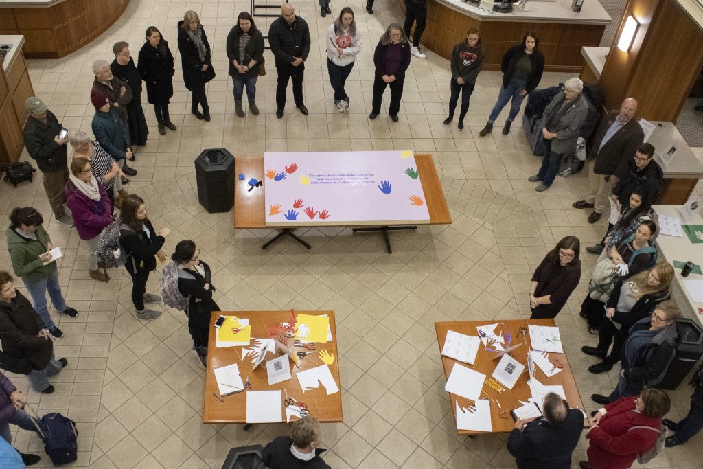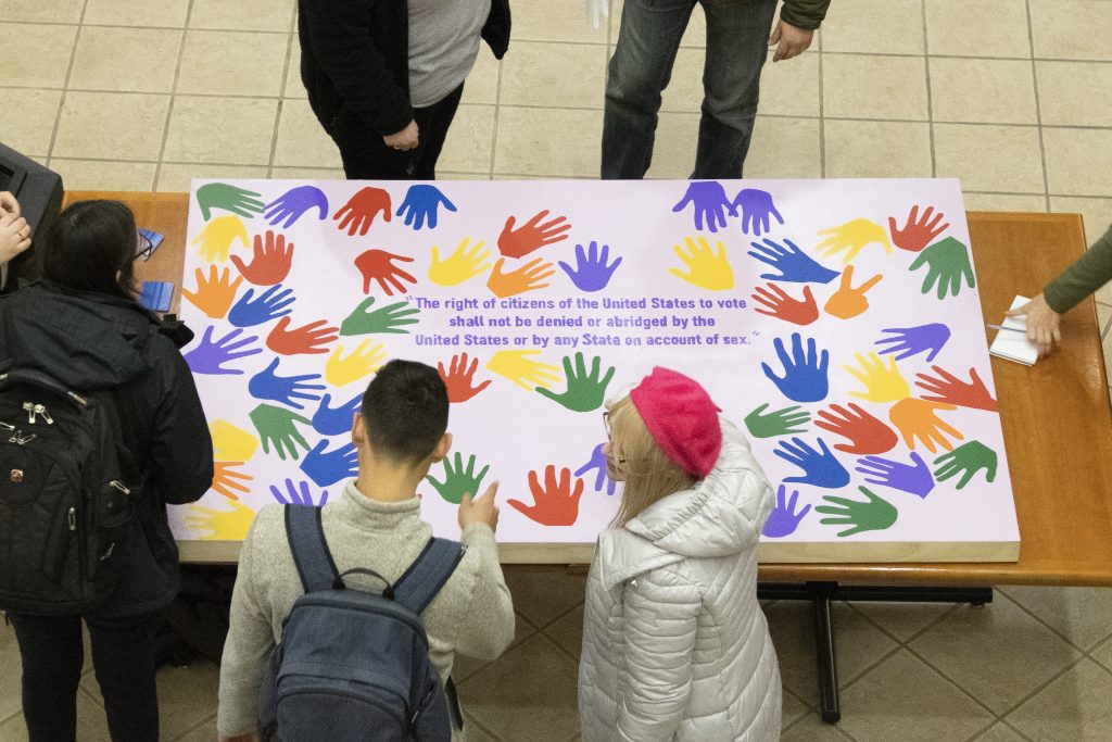 In the foyer of Hamersly Library, students and faculty met on Jan. 14 to celebrate the 100th anniversary of the ratification of the 19th Amendment. To commemorate the occasion, attendees were invited to add a rainbow cutout of their hand to a mural upon which the amendment was printed, symbolizing the diversity of individuals who fought for women’s suffrage and are still supporting women’s rights today.