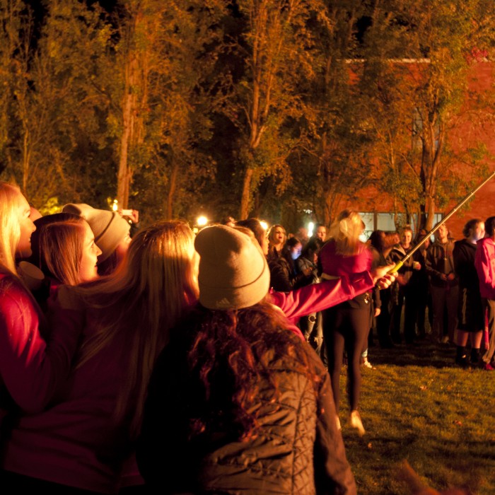 The annual Bonfire Kickoff to Homecoming Week occurred on the lawn outside the math and nursing building the evening of Oct. 12, 2015.