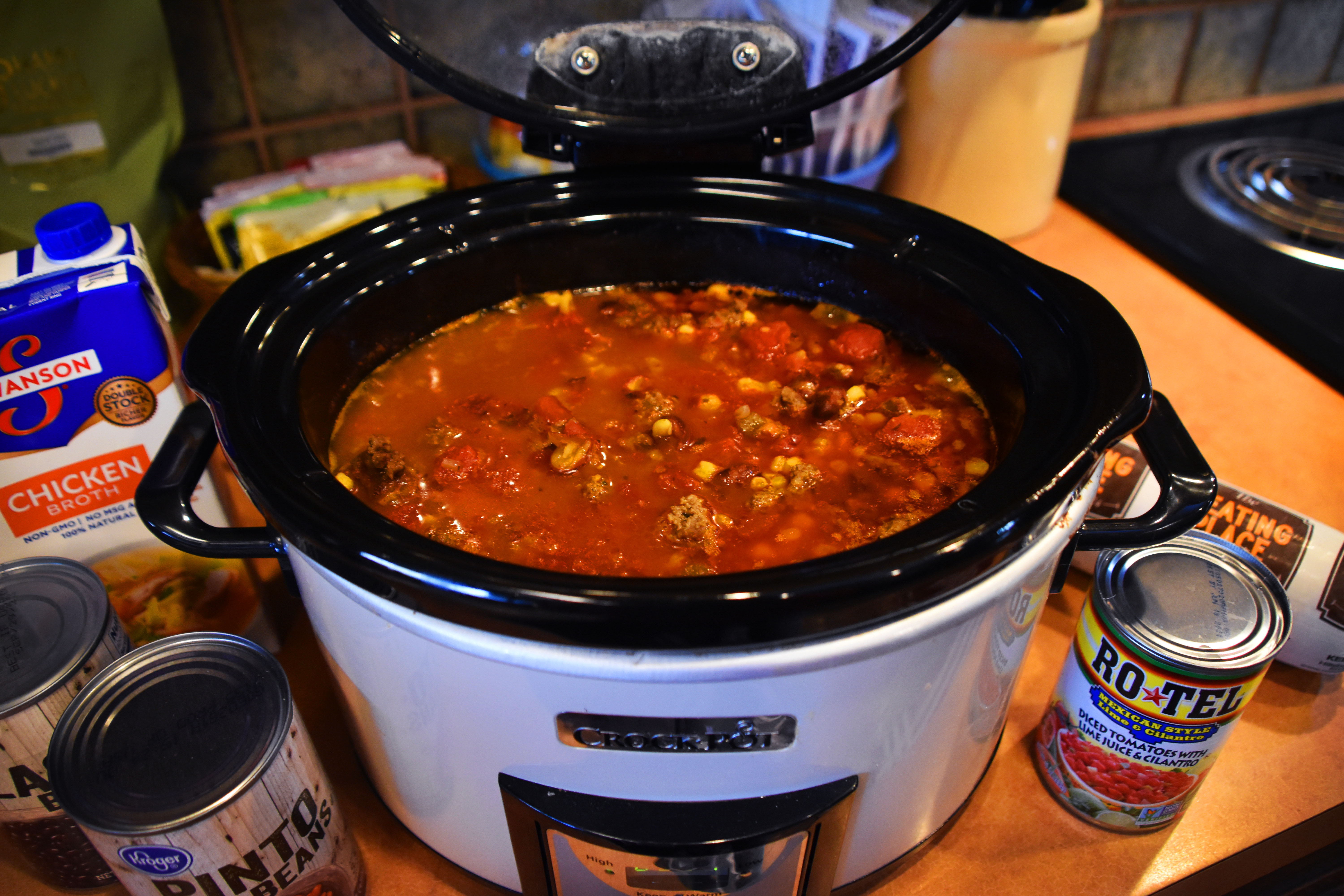 Combine the beef, onions and remaining soup ingredients in a slow cooker and stir. Cook on low for six to seven hours. Upon serving, top with toppings such as crushed tortilla chips, sour cream, cilantro, red onion and lime juice.